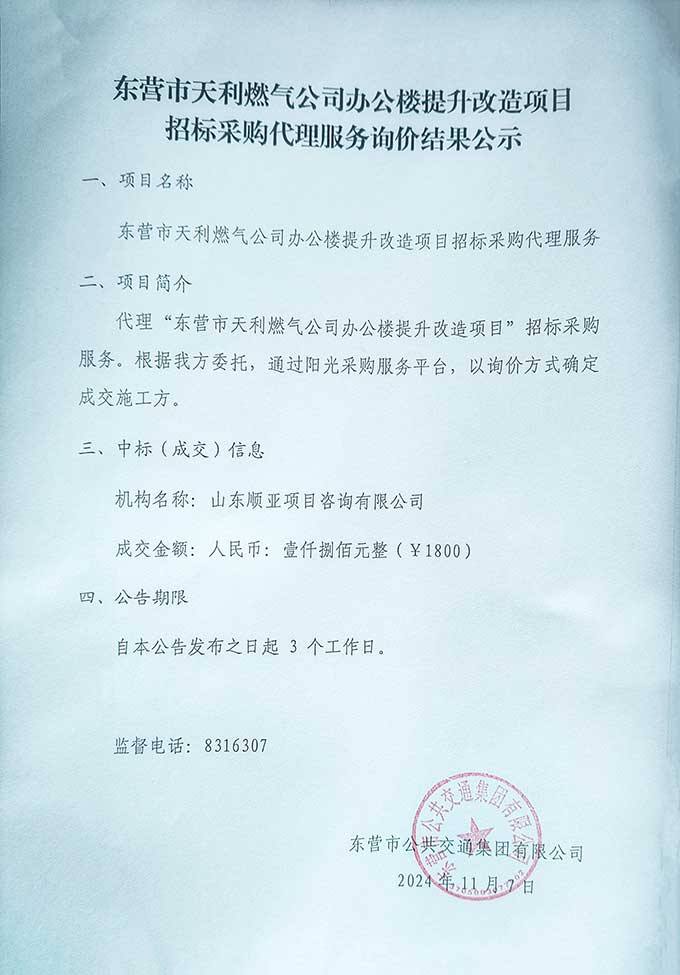 東營市天利燃氣公司辦公樓提升改造項目招標(biāo)采購代理服務(wù)詢價結(jié)果公示