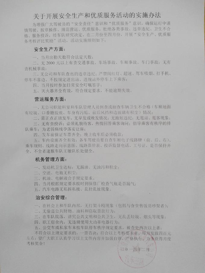 為增強(qiáng)廣大駕駛員的“安全責(zé)任”意識和“優(yōu)質(zhì)服務(wù)”意識,促使駕駛員出車前做好車輛檢查和衛(wèi)生保潔,運(yùn)行中謹(jǐn)慎駕駛、優(yōu)質(zhì)服務(wù),收車后規(guī)范停車,減少各類違章違紀(jì)、服務(wù)投訴和行車事故,杜絕單車衛(wèi)生不合格和不收款現(xiàn)象發(fā)生,實現(xiàn)職工薪金跨年度平穩(wěn)過渡,市公交公司汽車三隊充分利用部分工資結(jié)余,發(fā)揮經(jīng)濟(jì)杠桿作用,自2014年2月份起制定實施了“安全生產(chǎn)和優(yōu)質(zhì)服務(wù)考評獎勵辦法”。