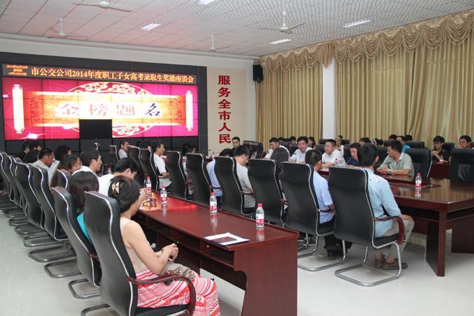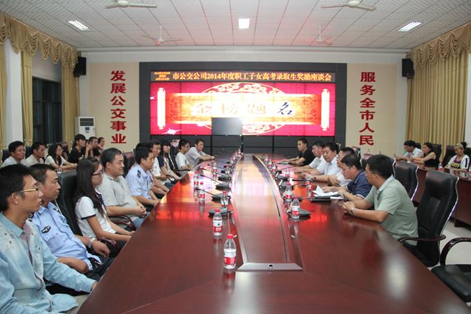 8月28日晚,市公交公司舉行了2014年度職工子女高考錄取生獎(jiǎng)勵(lì)座談會(huì),為今年高考錄取的職工子女進(jìn)行獎(jiǎng)勵(lì)。公司經(jīng)理朱新民出席,受獎(jiǎng)勵(lì)的職工及子女參加。