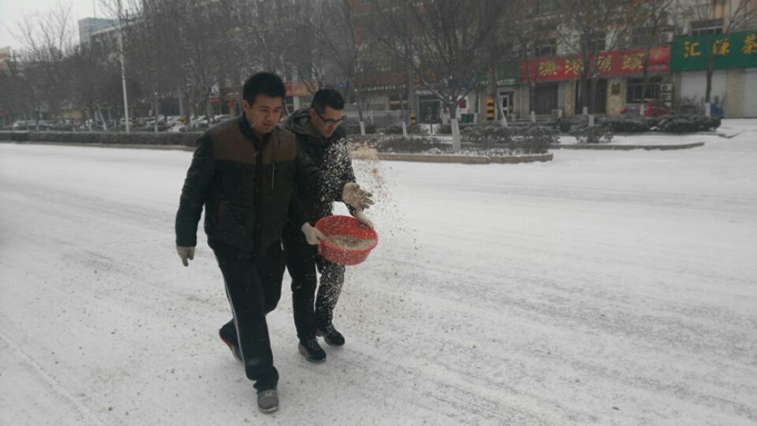 公交站點(diǎn)傾灑融雪劑 保障公交車出行順暢