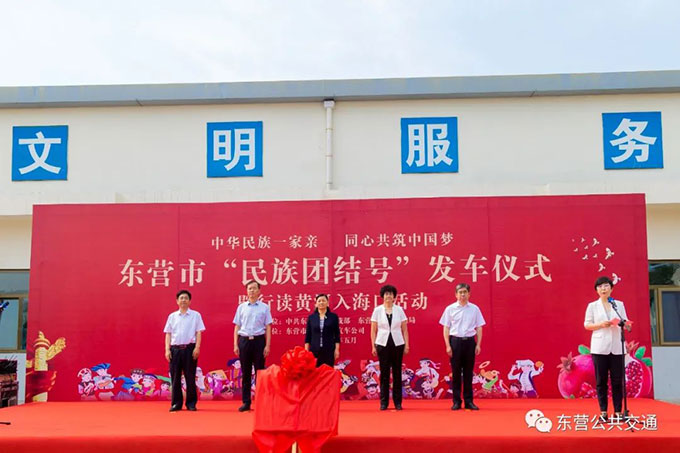 儀式現(xiàn)場(chǎng),民族團(tuán)結(jié)號(hào)公交車整裝待發(fā),車身煥然一新,貼有“中華民族一家親、同心共筑中國(guó)夢(mèng)”“各民族像石榴籽一樣緊緊擁抱雜一起”等字樣,融入東營(yíng)民族團(tuán)結(jié)進(jìn)步“石榴籽”“石榴花開黃河口”等地域元素,生動(dòng)展示了各民族群眾在黃河入海口攜手團(tuán)結(jié)奮斗、共創(chuàng)美好生活的故事,市公交公司黨委書記趙龍同志現(xiàn)場(chǎng)就民族團(tuán)結(jié)號(hào)公交車籌備情況作了匯報(bào)。市交通運(yùn)輸局黨組成員、市鐵路港航發(fā)展中心主任朱勝勇致辭,市人大常委會(huì)副主任張敏,市政協(xié)副主席王新明為東營(yíng)市民族團(tuán)結(jié)號(hào)揭牌,市委常委、統(tǒng)戰(zhàn)部部長(zhǎng)郭艷發(fā)表講話,并宣布東營(yíng)市民族團(tuán)結(jié)號(hào)發(fā)車。