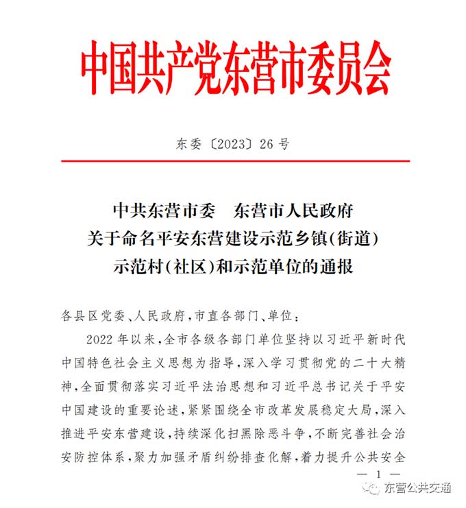 近日,市委市政府聯(lián)合印發(fā)《關(guān)于命名平安東營建設(shè)示范鄉(xiāng)鎮(zhèn)(街道)示范村(社區(qū))和示范單位的通報》(東委〔2023〕26號),市公交公司再獲表彰,被市委市政府命名為市級平安交運(yùn)企業(yè)