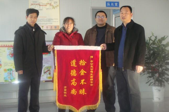 12月11日上午,東營經(jīng)濟(jì)開發(fā)區(qū)方圓銅業(yè)的武繼峰先生拿著一面寫有“拾金不昧、道德高尚”的錦旗來到市公交公司汽車五隊(duì),感謝161路駕駛員王清娟師傅拾金不昧的高尚品德。據(jù)車隊(duì)了解得知,12月9日晚上,汽車五隊(duì)駕駛員王清娟在運(yùn)行完161路班次后正常清理車廂衛(wèi)生時(shí)發(fā)現(xiàn)了一個(gè)女士皮包并立即將皮包上交車隊(duì)。車隊(duì)值班人員通過清點(diǎn),發(fā)現(xiàn)皮包內(nèi)共有現(xiàn)金、手機(jī)、鑰匙、身份證、個(gè)人用品等,根據(jù)包里面的手機(jī)信息及時(shí)聯(lián)系到了失主的丈夫武繼峰先生。12月10日上午武繼峰先生帶著有效證件來車隊(duì)將包領(lǐng)回?;丶液螅淅^峰先生心情久久不能平靜,特意制作了一面錦旗送到車隊(duì),代表全家來表達(dá)感激之情,武繼峰先生拿著錦旗,握著王隊(duì)長的手,非常激動(dòng)的連連表示感謝,并再三要求車隊(duì)對王清娟師傅這種拾金不昧的優(yōu)良品質(zhì)進(jìn)行表揚(yáng)。王隊(duì)長非常坦誠的告訴武繼峰先生,拾金不昧是我們公交行業(yè)多年來始終堅(jiān)持秉承的優(yōu)良傳統(tǒng),也是每名駕駛員應(yīng)盡的義務(wù),是我們公交人義不容辭的責(zé)任。